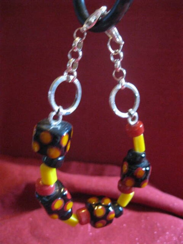 Au centre, une grande perle carrée noire, ornée de points jaunes et rouges, attire immédiatement le regard. Elle est encadrée par deux perles oblongues plates noires, ajoutant une touche de sophistication. De part et d'autre, deux perles jaunes oblongues et deux perles rouges tubulaires complètent ce tableau coloré, apportant une dynamique unique à l'ensemble.