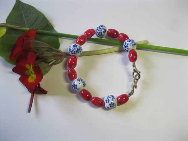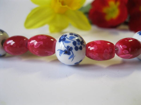 Ce bracelet unique est façonné avec soin pour ajouter une touche de sophistication à votre style. Il se compose de perles ovales en rose foncé, délicatement intercalées avec des perles rondes en blanc. Le design est rehaussé par de petites fleurs bleues, légèrement plus grandes, qui apportent une note de couleur et de charme.