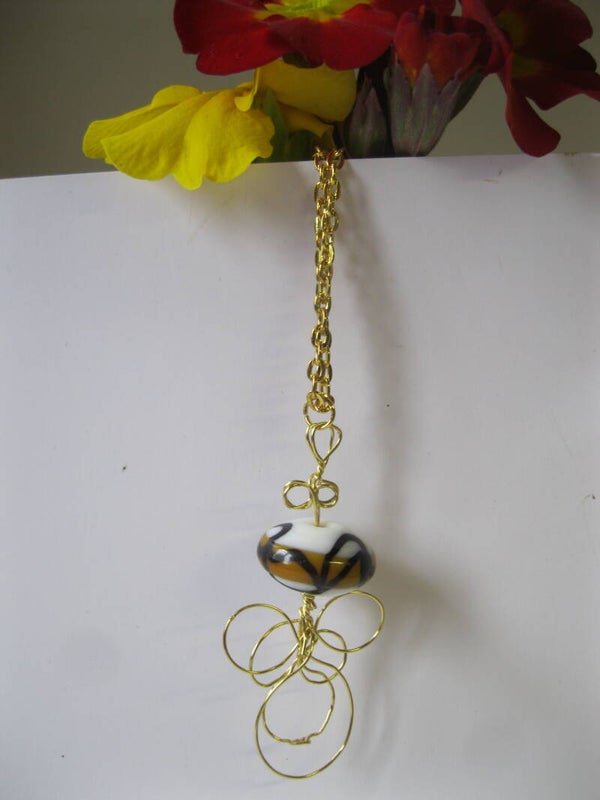 Découvrez ce magnifique collier artisanal, façonné à la main avec soin et créativité. Ce bijou unique est composé d'un fil doré élégamment torsadé, formant des boucles et des motifs délicats qui captent la lumière à chaque mouvement. Au centre, une perle décorative aux teintes noires et blanches ajoute une touche de sophistication et d'originalité.