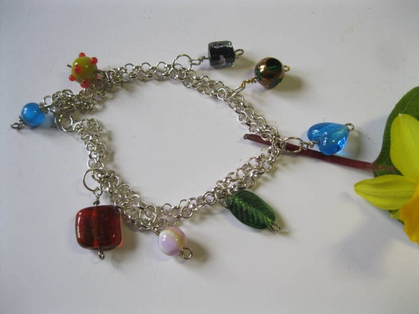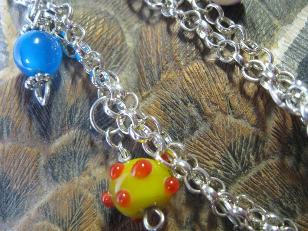 Faites sensation avec ce bracelet audacieux et tape-à-l'œil, conçu pour attirer tous les regards. Ce bijou unique est composé de perles de verre colorées et variées, chacune apportant une touche de couleur et de texture distincte. Les perles sont suspendues à une double chaîne à grands maillons en métal argenté, offrant un contraste élégant et moderne.