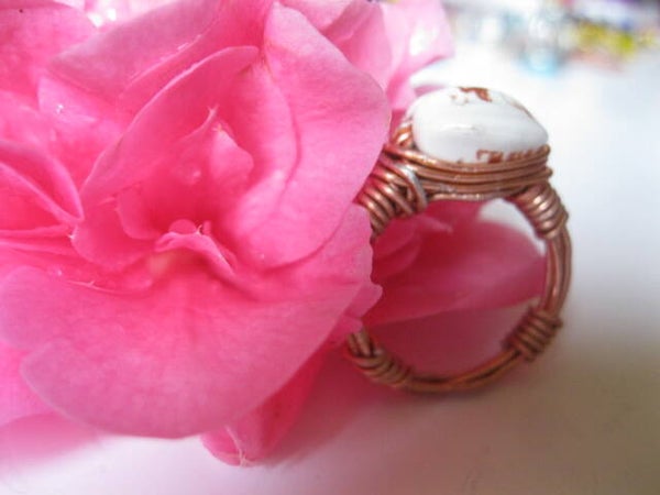 Bague en fil de cuivre avec pierre blanche à dessin marron -R1108