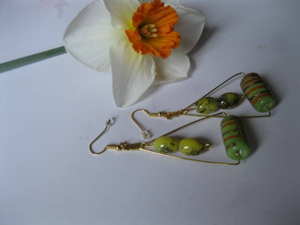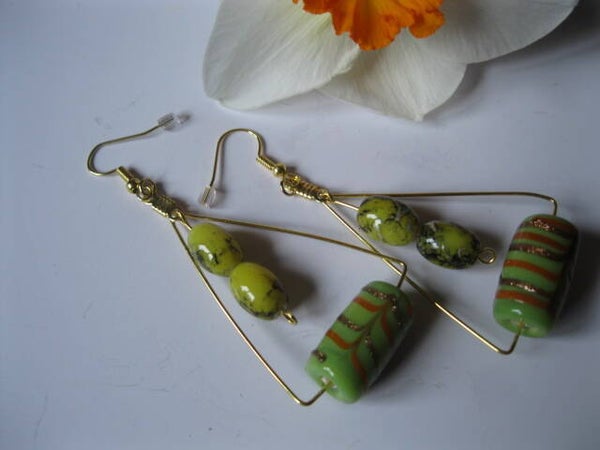 Laissez-vous charmer par ces boucles d'oreilles artisanales en perles vertes et oranges sur une fil en metal argenté en forme du triangle. Leur design géométrique et leurs couleurs vibrantes en font un accessoire unique, parfait pour sublimer vos tenues estivales ou printanières.