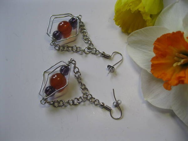 Ces boucles d'oreilles en perles d'ambre et d'améthyste, suspendues à une structure en fil d'argent, sont un véritable bijou de sophistication. Leur design moderne et leurs couleurs intenses en font un accessoire incontournable pour les amateurs de style raffiné