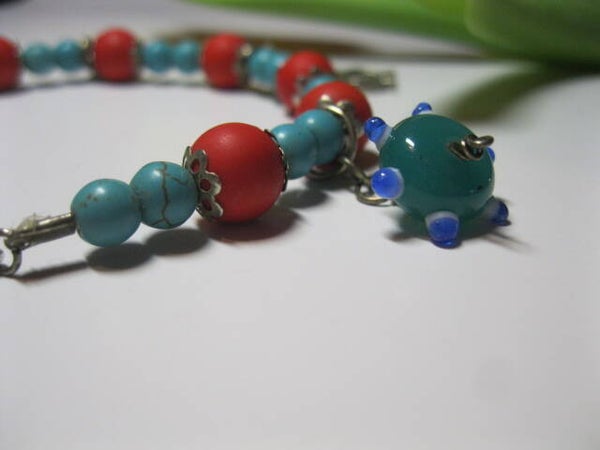 Ce bracelet artisanal est orné de perles rouges et turquoise, ainsi que des breloques délicats, pour un look à la fois ludique et sophistiqué. Parfait pour les amateurs de bijoux uniques, il ajoutera une touche de fantaisie à votre style quotidien.